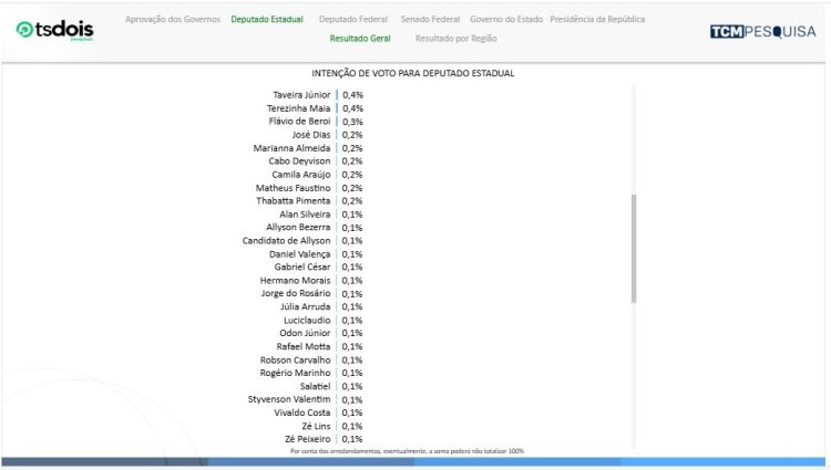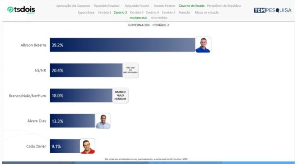 No Cenário 2, Allyson Bezerra aparece com 39,2%. Não sabem ou não responderam 20,4%. Branco/nulo/nenhum são 18,0%. Álvaro Dias tem 13,3% da intenção de votos e Cadu Xavier 9,1%.