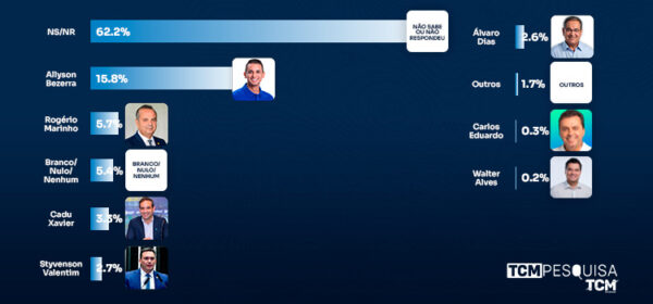 Na pesquisa espontânea, não sabem/não responderam 62,2%. Allyson Bezerra aparece com 15,8%. Rogério Marinho tem 5,7%. Branco/nulo/nenhum 5,4%. Cadu Xavier aparece com 3,3%. Styvenson Valentim com 2,7%. Álvaro Dias com 2,6%. Outros 1,7%. Carlos Eduardo com 0,3% e Walter Alves 0,2%.