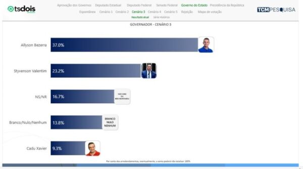 No Cenário 3, Allyson Bezerra aparece com 37,0%. Styvenson Valentim 23,2%. Não sabem ou não responderam 16,7%. Branco/nulo/nenhum são 13,8%. Cadu Xavier 9,3%.