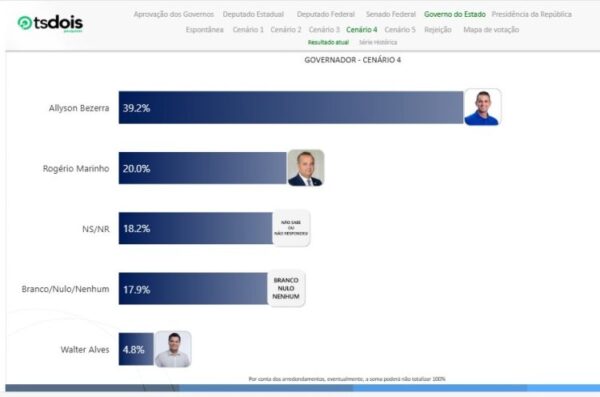 No Cenário 4, Allyson Bezerra aparece com 39,2%. Rogério Marinho tem 20,0%. Não sabem ou não responderam 18,2%. Branco/nulo/nenhum são 17,9%. Walter Alves 4,8%.