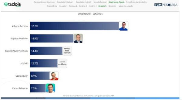 No Cenário 5, Allyson Bezerra aparece com 37,7%. Rogério Marinho tem 18,9%. Branco/nulo/nenhum são 14,4%. Não sabem ou não responderam 12,7%. Cadu Xavier 8,9%. Carlos Eduardo 7,3%.