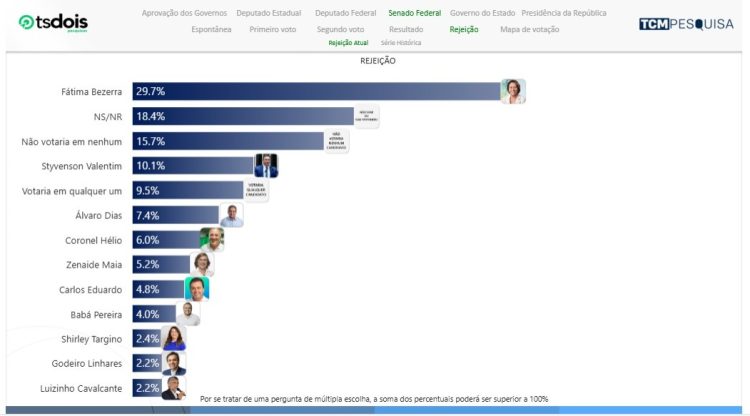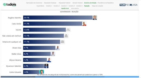 No quesito rejeição, Rogério Marinho aparece com 20,1%, Cadu Xavier com 17,3%, não sabem ou não responderam 12,6%, não votaria em nenhum 12,1%, votaria em qualquer um 11,1%, Álvaro Dias 9,7%, Walter Alves 8,2%, Allyson Bezerra 7,2%, Styvenson Valentim 6,3% e Carlos Eduardo tem 5,0% de rejeição.