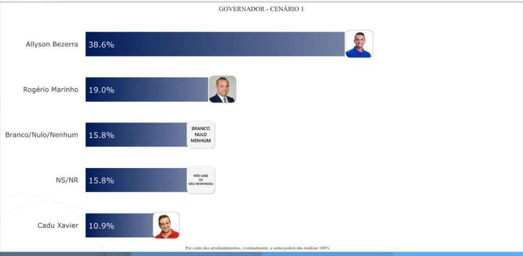No cenário 01, Allyson Bezerra aparece com 38,6%. Rogério Marinho tem 19,0%. Branco/nulo/nenhum com 15,8%. Não sabe/não respondeu 15,8%. Cadu Xavier tem 10,9%.