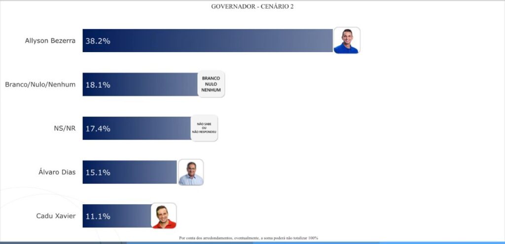 No cenário 02, Allyson Bezerra tem 38,2%. Branco/nulo/nenhum com 18,1%. Não sabe/não respondeu 17,4%. Álvaro Dias tem 15,1%. Cadu Xavier tem 11,1%.