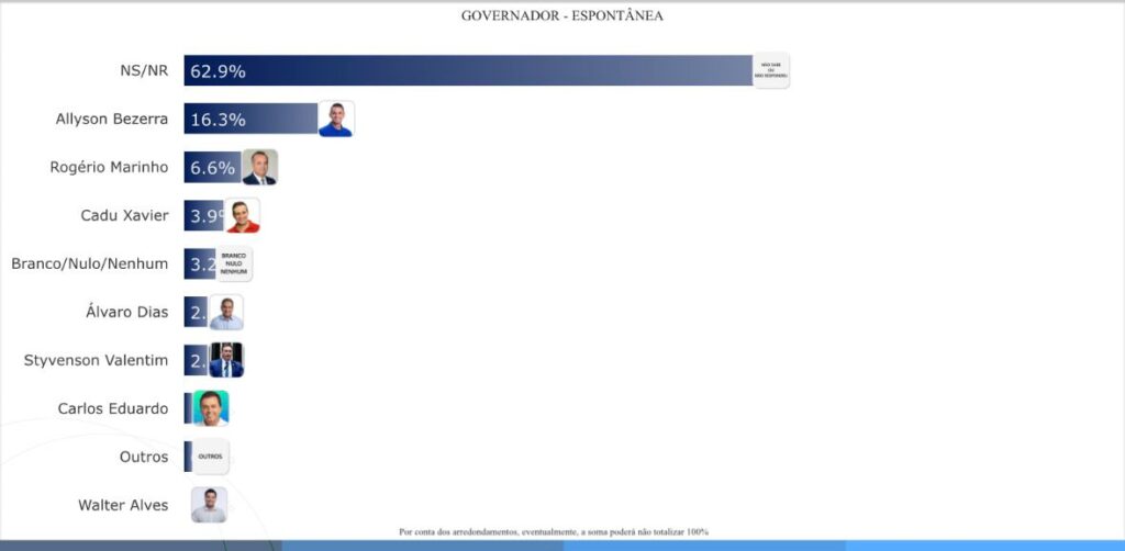 Na espontânea, não sabem/não responderam têm 62,9%. Em seguida aparece Allyson Bezerra com 16,3%. Rogério Marinho logo após com 6,6%. Cadu Xavier tem 3,9%. Branco/nulo/nenhum com 3,2%. Álvaro Dias tem 2,9%. Styvenson Valentim tem 2,7%. Carlos Eduardo aparece com 1,1%. Outros com 0,5%. Walter Alves tem 0,1%.