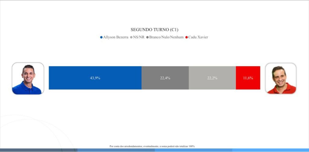No cenário 01 de segundo turno, Allyson Bezerra tem 43,9%. Branco/nulo/nenhum 22,4%. Não sabe/não respondeu 22,2%. Cadu Xavier tem 11,6%.