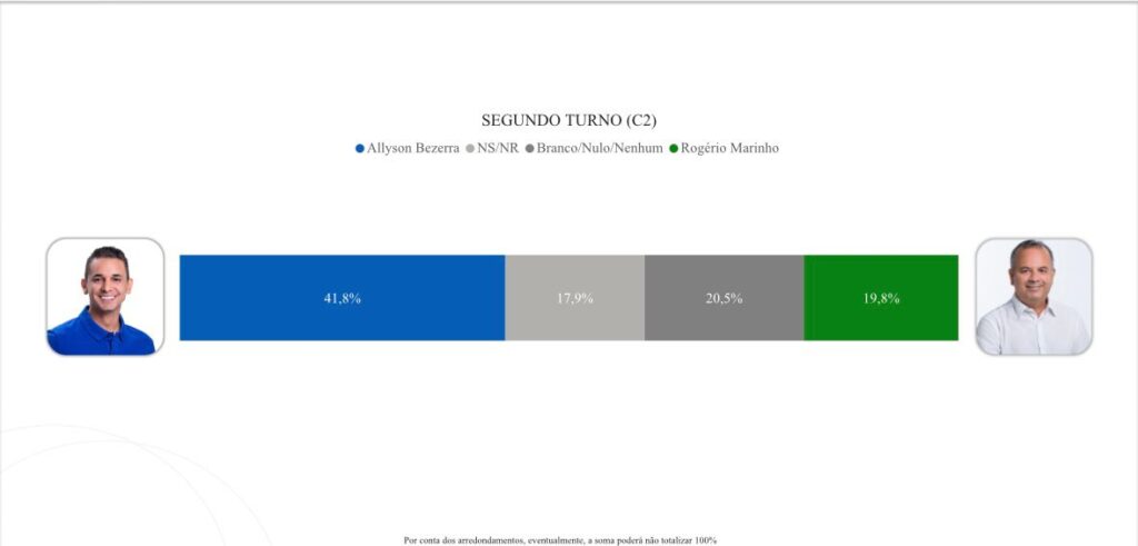 No cenário 02 de segundo turno, Allyson Bezerra tem 41,8%. Branco/nulo/nenhum 20,5%. Rogério Marinho tem 19,8%. Não sabe/não respondeu 17,9%.