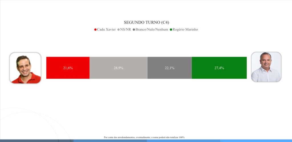 No cenário 04 de segundo turno, Rogério Marinho tem 27,4%. Não sabe/não respondeu tem 28,9%. Branco/nulo/nenhum com 22,1%. Cadu Xavier tem 21,6%.