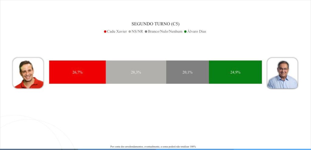 No cenário 05 de segundo turno, não sabe/não respondeu tem 28,3%. Cadu Xavier tem 26,7%. Álvaro Dias tem 24,9%. Branco/nulo/nenhum tem 20,1%.