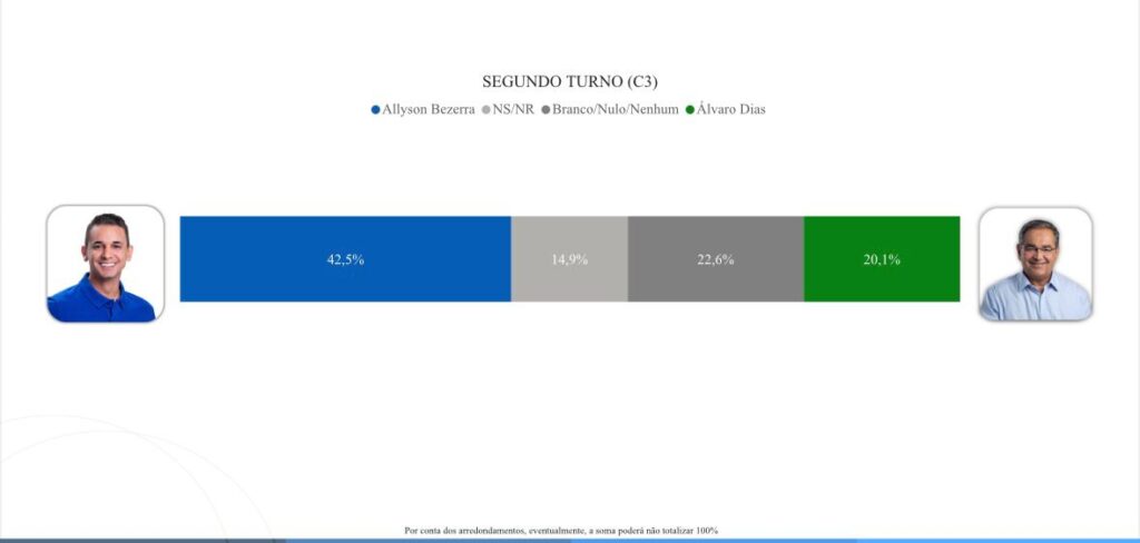 No cenário 03 de segundo turno, Allyson Bezerra tem 42,5%. Branco/nulo/nenhum tem 22,6%. Álvaro Dias tem 20,1%. Não sabe/não respondeu 14,9%.