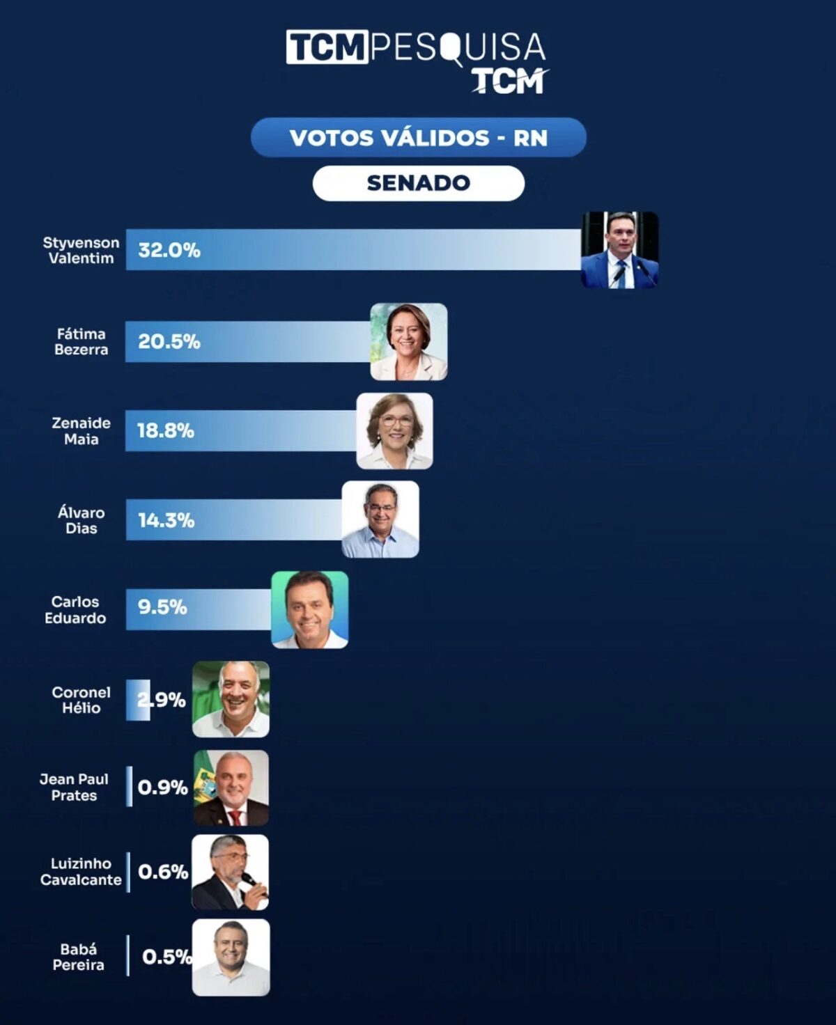 Na espontânea, não sabem/não responderam têm 62,9%. Em seguida aparece Allyson Bezerra com 16,3%. Rogério Marinho logo após com 6,6%. Cadu Xavier tem 3,9%. Branco/nulo/nenhum com 3,2%. Álvaro Dias tem 2,9%. Styvenson Valentim tem 2,7%. Carlos Eduardo aparece com 1,1%. Outros com 0,5%. Walter Alves tem 0,1%.