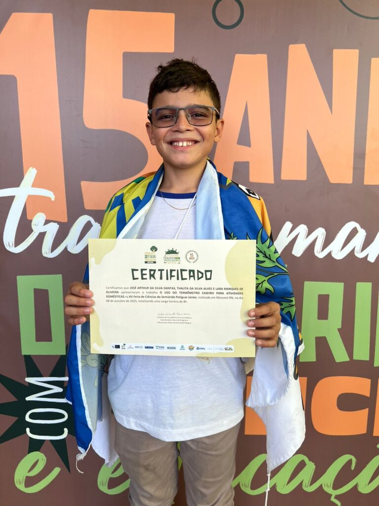 O aluno José Arthur da Silva Dantas, do 7º ano da Escola Vila Ceará, conquistou o 1º lugar na Feira de Ciências do Semiárido Potiguar (FCSP), realizada na Ufersa, com o projeto “Uso de termômetro caseiro para atividades domésticas”.