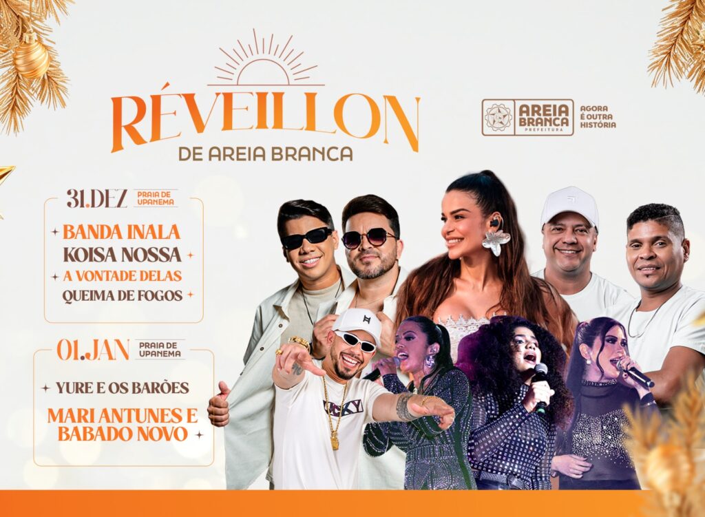Já no dia 1º de janeiro, a programação promovida pela Prefeitura de Areia Branca começa na Praia de Upanema, com show de Yure e Os Barões. Logo após, a festa segue em um grande arrastão da praia ao centro da cidade, comandado por Mari Antunes e Babado Novo, levando alegria, música e energia pelas ruas de Areia Branca.
