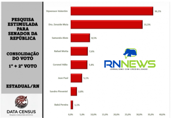 A pesquisa do RN News, realizada pelo instituto Data Census, mostra como está a disputa para o Senado Federal considerando o 1º + 2º voto consolidado.